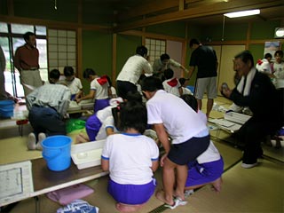 朝からの雨により、児童たちは川へ入れませんでしたが、ビデオ研修を踏まえての実践(じっせん)となりました。